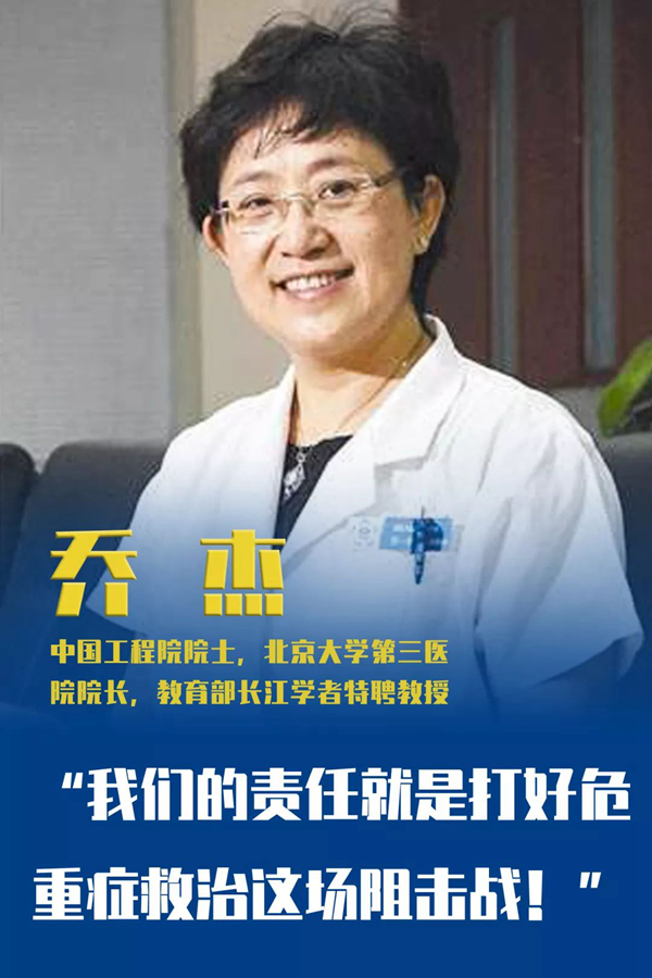 北京大學自創(chuàng)建以來,始終與國家和民族同呼吸共命運。此次新冠狀病毒感染疫情嚴重,情況危急。北大迅速派出附屬醫(yī)院的多批醫(yī)療隊馳援武漢。截止到2月13日,北大援鄂抗疫國家醫(yī)療隊已累計收治危重癥患者200余例,而作為領導組組長,喬杰也已在武漢駐守12天。她協同各院領導和專家組成員,迅速梳理工作流程,從管理體制建立、到病房改造,再到人員培訓,儀器設備調配,每一細節(jié)嚴格把關。她帶領團隊充分發(fā)揮北大醫(yī)學多學科合作優(yōu)勢,為提高新冠肺炎危重患者治愈率,降低病亡率履行著應盡的職責。
