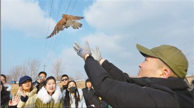 山東省青島市城陽區(qū)野生動植物保護志愿者在白沙河入??跐竦?,放歸一只救助的國家二級重點保護動物紅隼。 王海濱攝