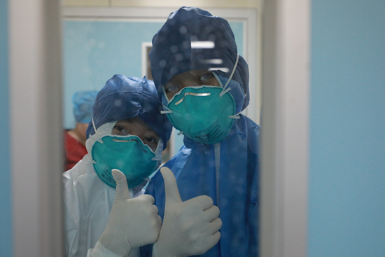 軍隊支援湖北醫(yī)療隊兩名90后護(hù)士在進(jìn)“紅區(qū)”前為自己加油。陳晨/攝