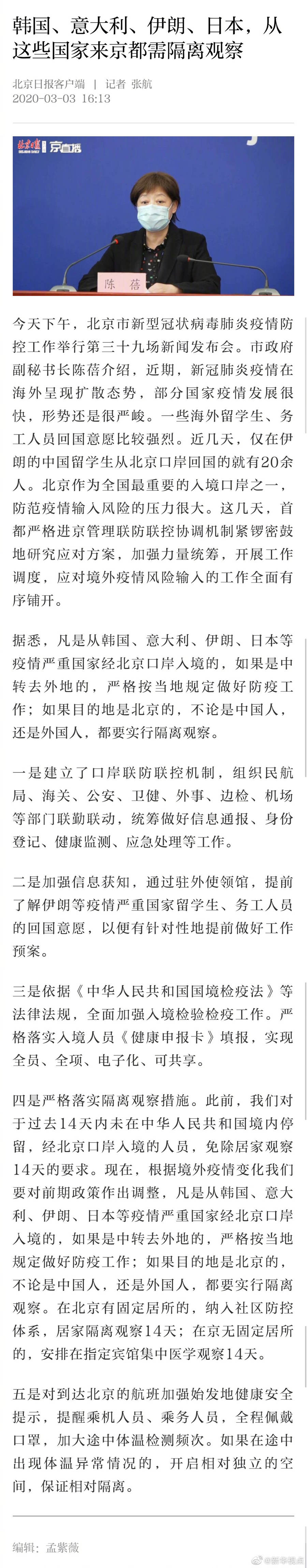 今天下午,北京市新型冠狀病毒肺炎疫情防控工作舉行第三十九場新聞發(fā)布會。市政府副秘書長陳蓓介紹,凡是從韓國、意大利、伊朗、日本等疫情嚴(yán)重國家經(jīng)北京口岸入境的,如果是中轉(zhuǎn)去外地的,嚴(yán)格按當(dāng)?shù)匾?guī)定做好防疫工作;如果目的地是北京的,不論是中國人,還是外國人,都要實(shí)行隔離觀察。