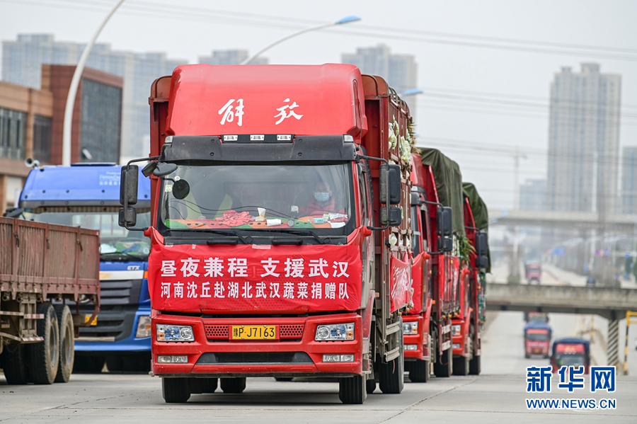 3月1日,河南沈丘退伍老兵王國輝帶隊第三次來到武漢送菜,將沈丘縣委縣政府采購的130噸農副產品捐贈給武漢。 新華社發(fā)(侯建勛 攝)
