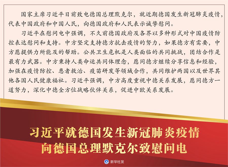 習(xí)近平在慰問電中強調(diào),不久前德國政府及各界以多種形式對中國疫情防控表達慰問和支持。中方堅定支持德方抗擊疫情的努力,如果德方有需要,中方愿提供力所能及的幫助。公共衛(wèi)生危機是人類面臨的共同挑戰(zhàn),團結(jié)合作是最有力武器。中方秉持人類命運共同體理念,愿同德方繼續(xù)分享信息和經(jīng)驗,加強在疫情防控、患者救治、疫苗研發(fā)等領(lǐng)域合作,共同維護兩國以及世界其他各國人民健康福祉。習(xí)近平強調(diào),中方高度重視中德關(guān)系發(fā)展,愿同德方一道努力,深化中德全方位戰(zhàn)略伙伴關(guān)系,促進中歐關(guān)系發(fā)展。