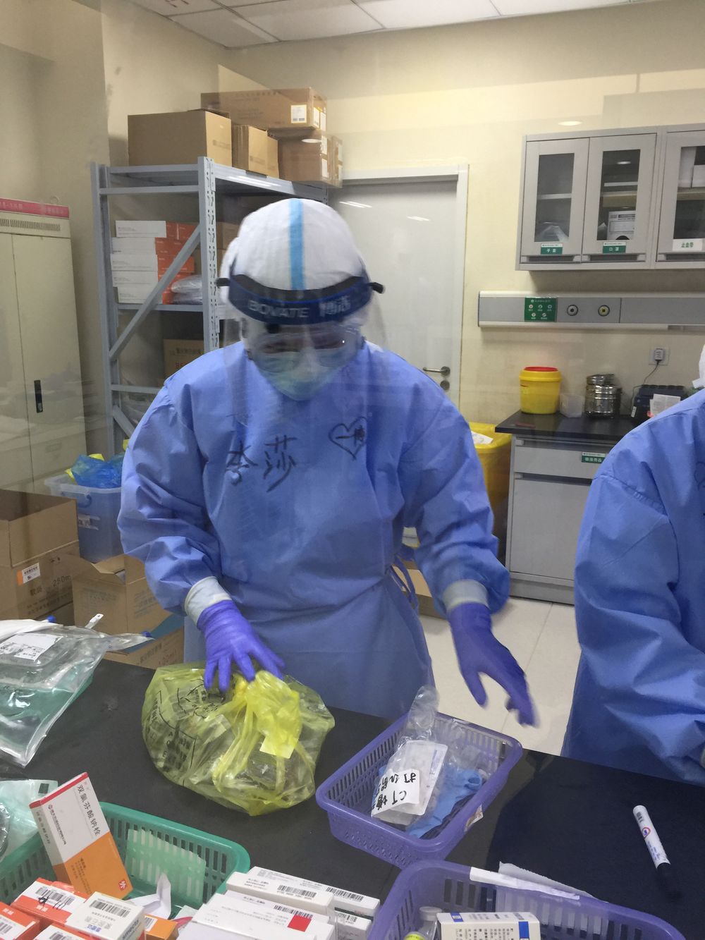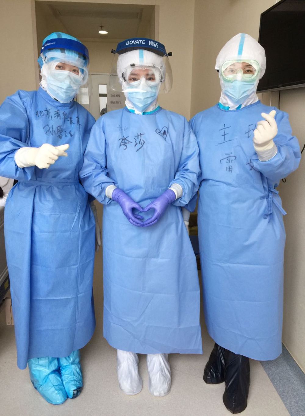 我想了想,有點(diǎn)開玩笑地說(shuō):“家人現(xiàn)在都很平安,唯一的心愿是可以見到我最喜歡的偶像王一博?!比缓笸聜兙推鸷逭f(shuō)要錄下來(lái),并在我的防護(hù)服上寫了四個(gè)大字“一博等我”。