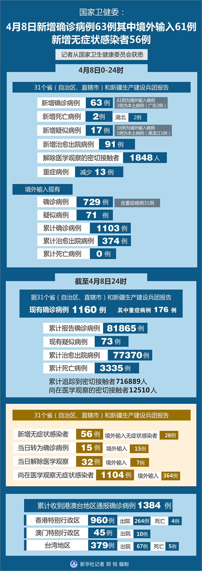 截至4月8日24時,據(jù)31個省(自治區(qū)、直轄市)和新疆生產(chǎn)建設兵團報告,現(xiàn)有確診病例1160例(其中重癥病例176例),累計治愈出院病例77370例,累計死亡病例3335例,累計報告確診病例81865例,現(xiàn)有疑似病例73例。累計追蹤到密切接觸者716889人,尚在醫(yī)學觀察的密切接觸者12510人。