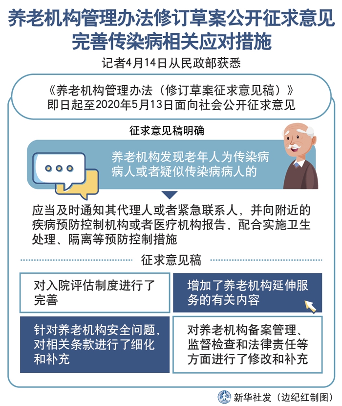 新華社北京4月14日電(記者孫少龍)記者14日從民政部獲悉,《養(yǎng)老機(jī)構(gòu)管理辦法(修訂草案征求意見稿)》即日起至2020年5月13日面向社會(huì)公開征求意見,結(jié)合新冠肺炎疫情防控要求,征求意見稿依法完善了養(yǎng)老機(jī)構(gòu)發(fā)現(xiàn)老年人為傳染病病人或者疑似傳染病病人時(shí)的應(yīng)對(duì)措施。