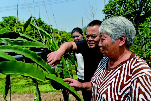 4月26日,廈門(mén)海滄青礁村院前社理事長(zhǎng)陳俊雄(中)在指導(dǎo)村民種植火龍果。 照片均由本報(bào)記者魏培全拍攝