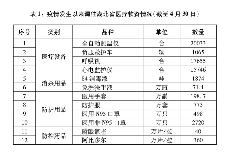 開展新中國成立以來規(guī)模最大的醫(yī)療支援行動。調(diào)動全國醫(yī)療資源和力量,全力支持湖北省和武漢市醫(yī)療救治。自1月24日除夕至3月8日,全國共調(diào)集346支國家醫(yī)療隊、4.26萬名醫(yī)務(wù)人員、900多名公共衛(wèi)生人員馳援湖北。19個省份以對口支援、以省包市的方式支援湖北省除武漢市以外16個地市,各省在發(fā)生疫情、防控救治任務(wù)十分繁重的情況下,集中優(yōu)質(zhì)醫(yī)療資源支援湖北省和武漢市。人民解放軍派出4000多名醫(yī)務(wù)人員支援湖北,承擔(dān)火神山醫(yī)院等3家醫(yī)療機(jī)構(gòu)的醫(yī)療救治任務(wù),空軍出動運輸機(jī)緊急運送醫(yī)療物資。各醫(yī)療隊從接受指令到組建2小時內(nèi)完成,24小時內(nèi)抵達(dá),并自帶7天防護(hù)物資,抵達(dá)后迅速開展救治。在全國緊急調(diào)配全自動測溫儀、負(fù)壓救護(hù)車、呼吸機(jī)、心電監(jiān)護(hù)儀等重點醫(yī)療物資支援湖北省和武漢市(表1)。從全國調(diào)集4萬名建設(shè)者和幾千臺機(jī)械設(shè)備,僅用10天建成有1000張病床的火神山醫(yī)院,僅用12天建成有1600張病床的雷神山醫(yī)院。短短10多天建成16座方艙醫(yī)院,共有1.4萬余張床位。加強(qiáng)臨床血液供應(yīng),10個省份無償支援湖北省紅細(xì)胞4.5萬單位,血小板1762個治療量,新鮮冰凍血漿137萬毫升(不含恢復(fù)期血漿)。大規(guī)模、強(qiáng)有力的醫(yī)療支援行動,有力保障了湖北省和武漢市救治,極大緩解了重災(zāi)區(qū)醫(yī)療資源嚴(yán)重不足的壓力。