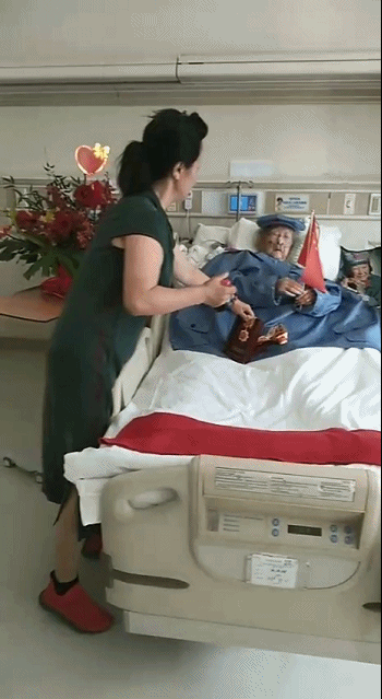 2019年10月1日,中華人民共和國迎來七十華誕。素來了解老人心思的陽瓊仙,專門帶了兩面國旗到病房里。閱兵開始后,滿頭銀發(fā)的王定國半躺在病床上,一手拿一面旗,隨著軍樂的節(jié)奏來回?fù)]舞,累了,歇一下,又接著揮,仿佛自己正身處天安門廣場(chǎng)熱情歡呼的人群中。