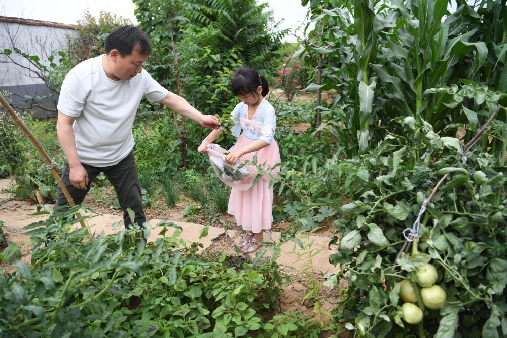 ↑?小思揚(yáng)和爸爸一起采摘蔬菜。