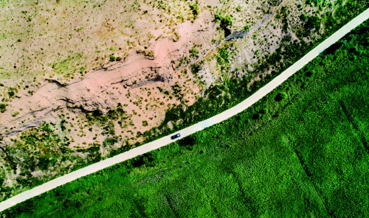 一輛汽車行駛在榆林市橫山區(qū)沙漠治理與未治理的分界公路上(2018年8月4日無人機(jī)拍攝)。
