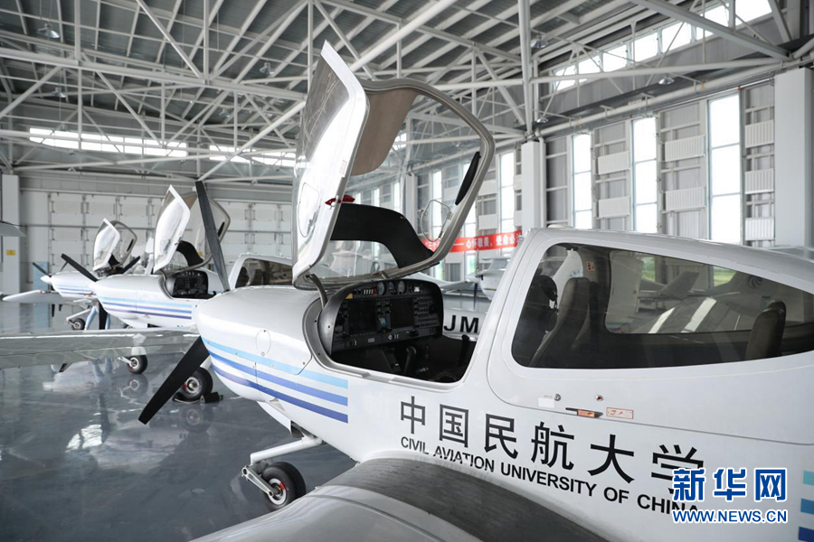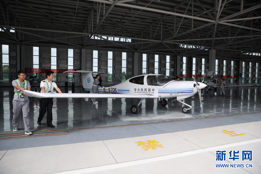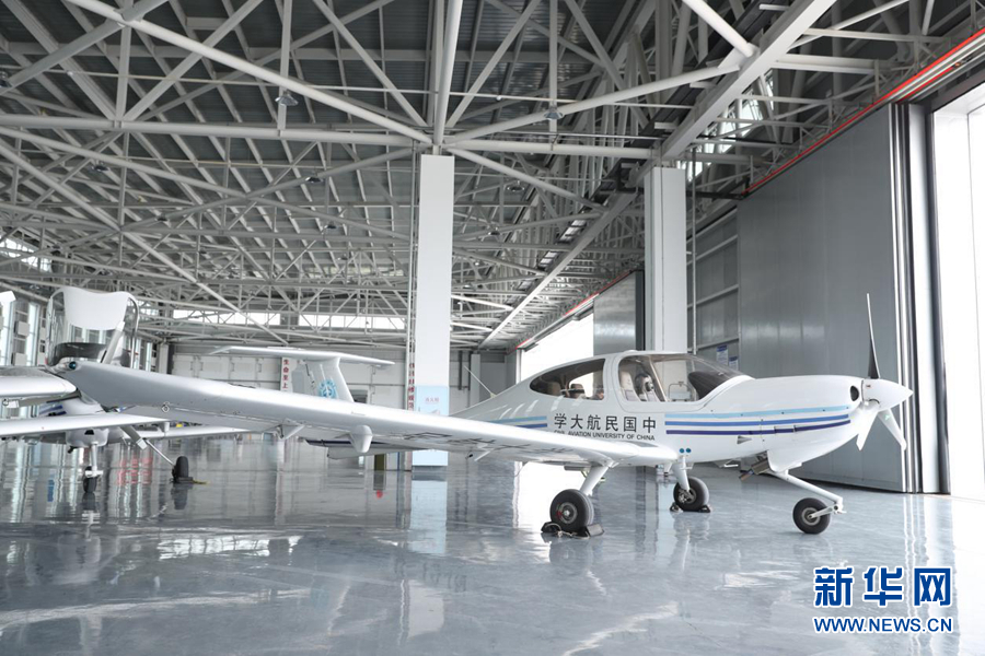 圖為中國民航大學(xué)內(nèi)蒙古飛行學(xué)院機庫中待飛的單發(fā)DA40D飛機。新華網(wǎng)記者焦鵬 攝