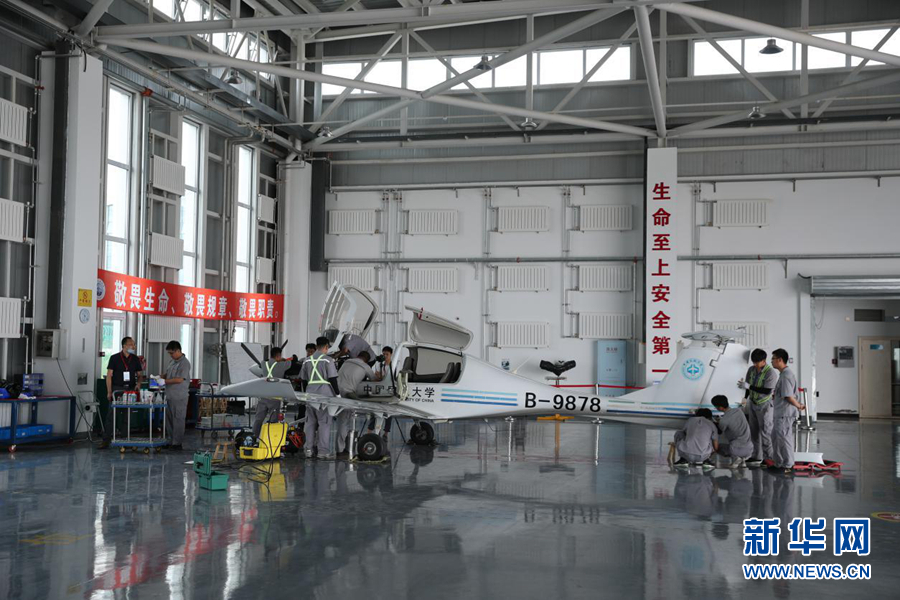 圖為機務(wù)人員在檢修飛行達到1000小時的訓(xùn)練機。新華網(wǎng)記者焦鵬 攝