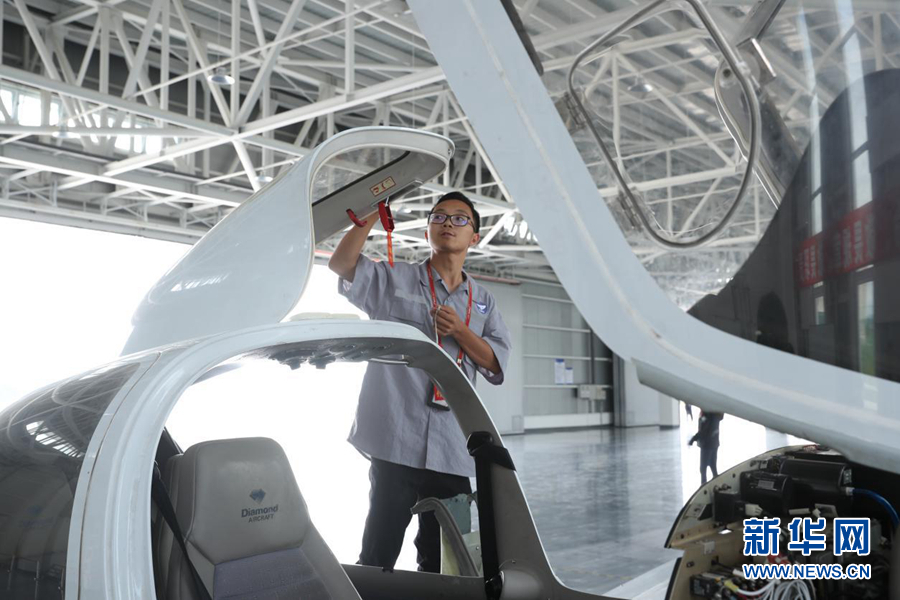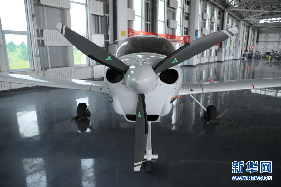 圖為機庫中待飛的單發(fā)DA40D飛機。新華網(wǎng)記者焦鵬 攝