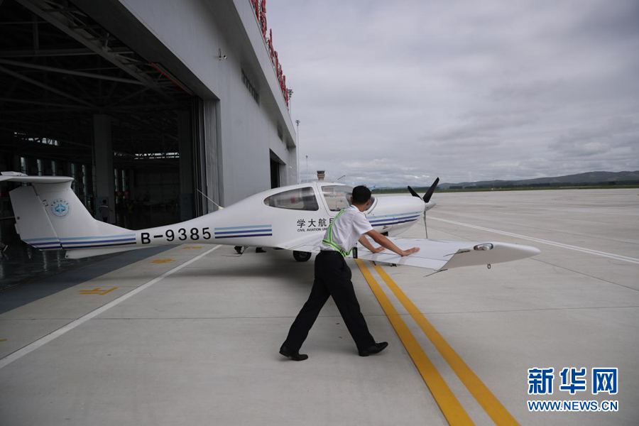 圖為訓(xùn)練飛行前飛行學(xué)員將訓(xùn)練機推出機庫。新華網(wǎng)記者焦鵬 攝