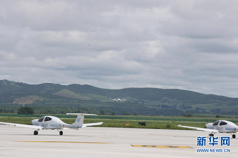 圖為飛行學(xué)員駕駛訓(xùn)練機從扎蘭屯成吉思汗機場起飛。新華網(wǎng)記者焦鵬 攝