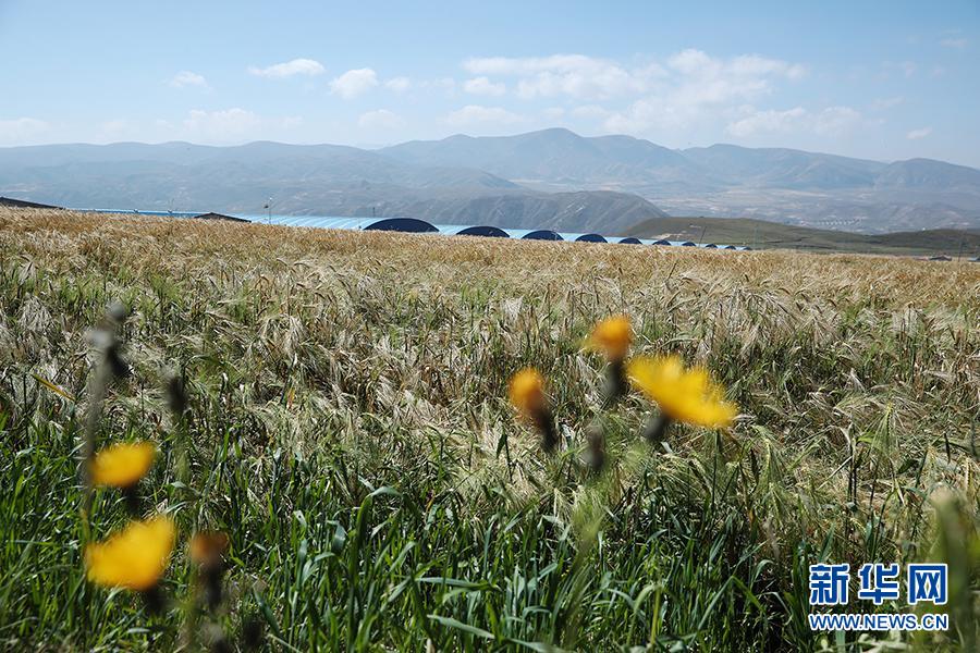 東達(dá)村的青稞迎來(lái)豐收,遠(yuǎn)處藍(lán)色頂棚建筑是東達(dá)村養(yǎng)殖場(chǎng)。新華網(wǎng)記者焦鵬攝