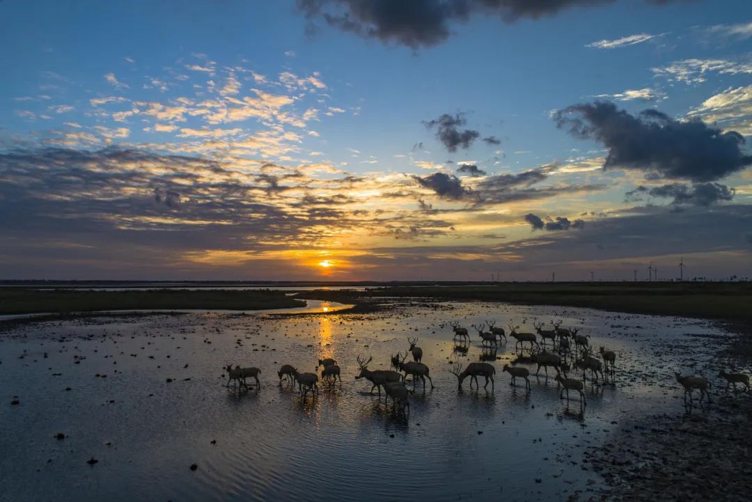 10月7日,江蘇省鹽城市大豐黃海野麋蕩中的麋鹿在濕地中自由地覓食 (圖片來源:視覺中國)