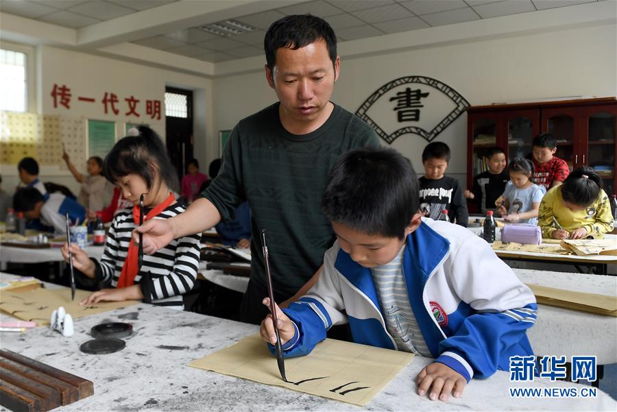 陜西省延安市楊家?guī)X福州希望小學(xué)書法社團的學(xué)生在老師指導(dǎo)下練習(xí)書法(4月24日攝)。新華社記者 劉瀟 攝