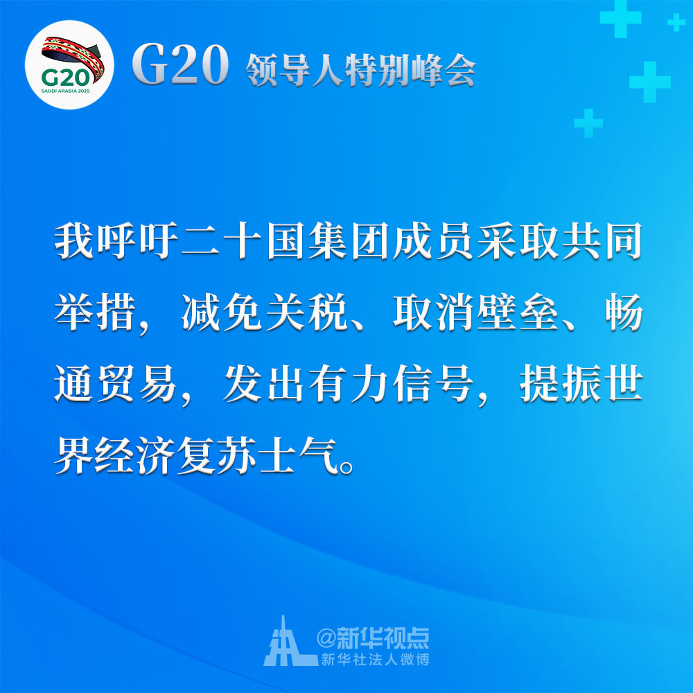 我呼吁二十國集團成員采取共同舉措,減免關稅、取消壁壘、暢通貿(mào)易,發(fā)出有力信號,提振世界經(jīng)濟復蘇士氣。我們應該制定二十國集團行動計劃,并就抗疫宏觀政策協(xié)調(diào)及時作出必要的機制性溝通和安排。