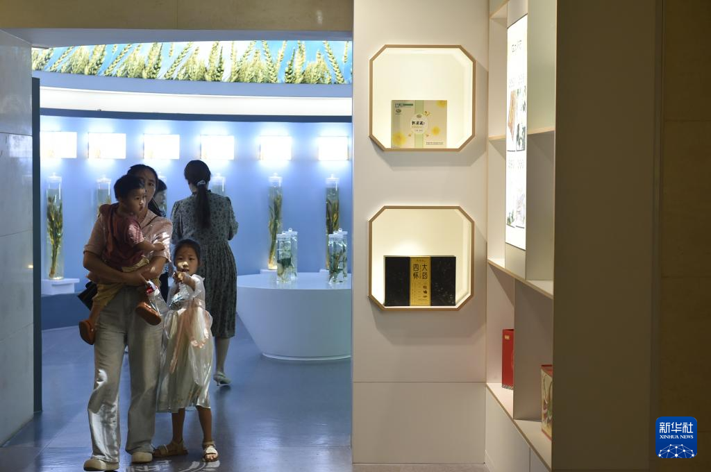 9月16日,讲解员(右二)在温县小麦博物馆为观众介绍展品。