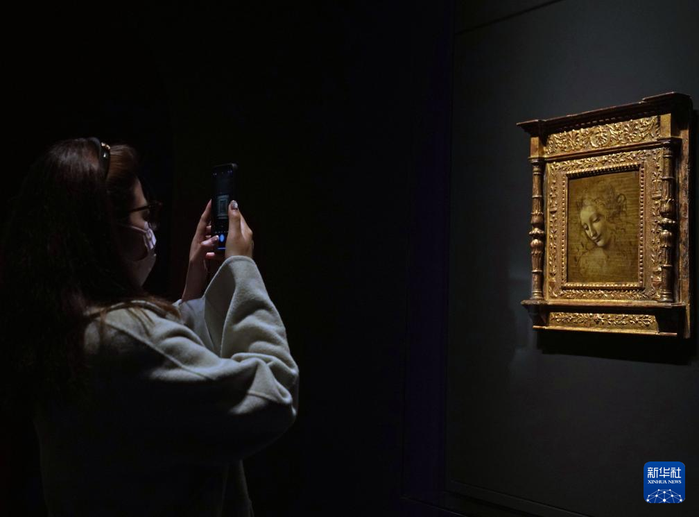 12月9日,媒体人员在参观达·芬奇的油画《头发飘逸的女子》。