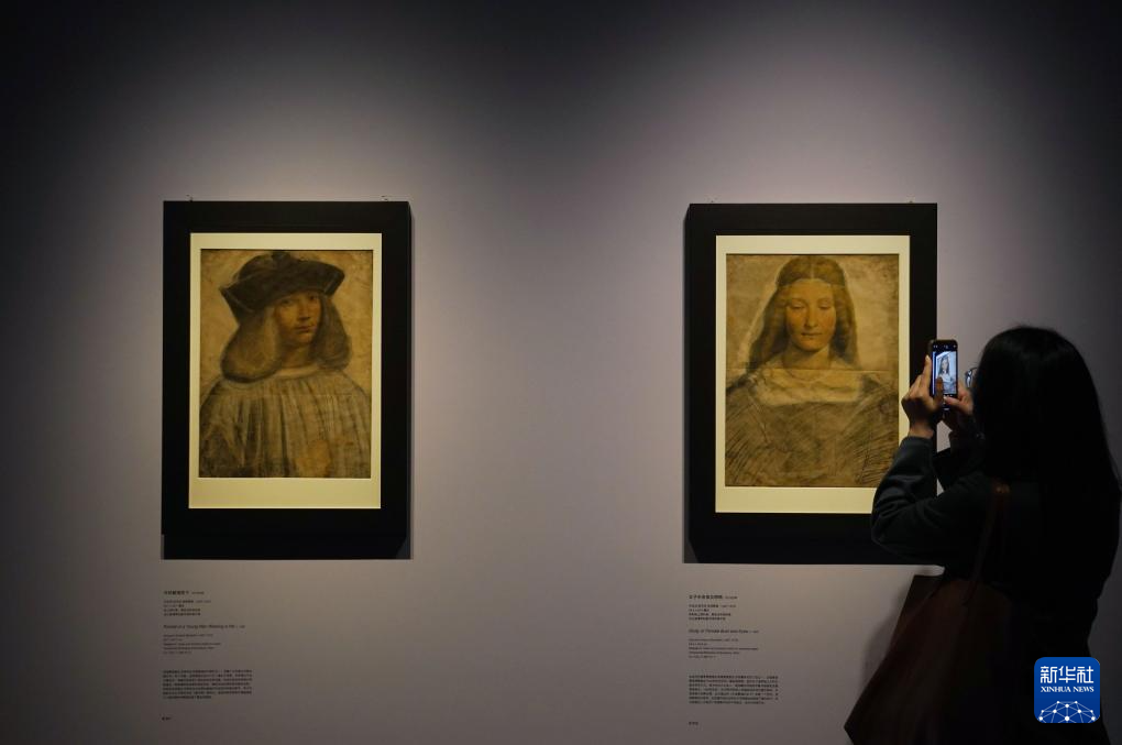 12月9日,媒体人员在参观达·芬奇的学生波塔费奥的画作《年轻戴帽男子》(左)和《女子半身像及眼睛》(右)。
