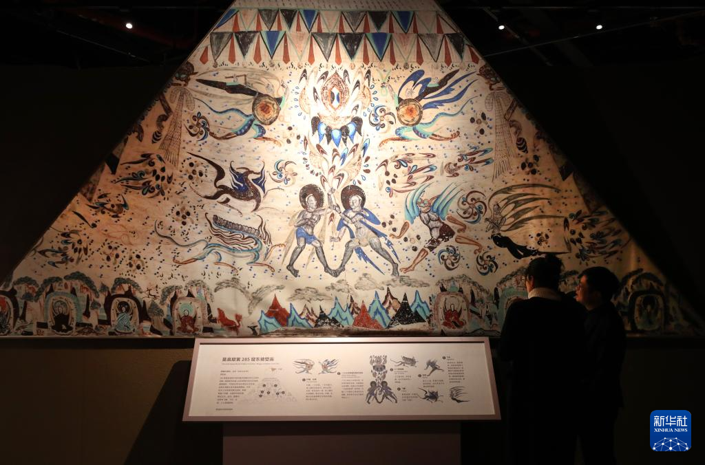 12月21日,参观者在莫高窟第285窟东披壁画(复制品)展品前交流讨论。