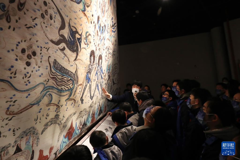 12月21日,讲解员在展览上向前来参观的中学生介绍莫高窟第285窟东披壁画(复制品)上的内容。