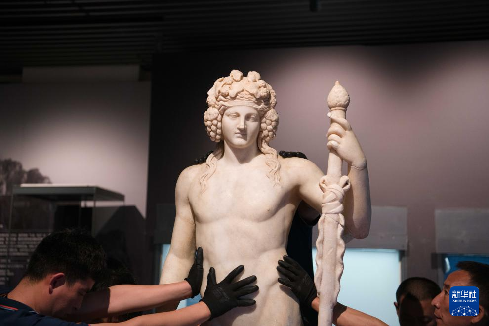 7月2日,开箱后的古希腊文物被工作人员移入展柜。