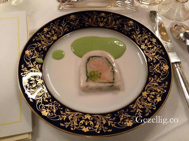 1、Terrine of fish and prawns watercress sauce – 魚蝦凍配綠豆瓣醬(前菜)