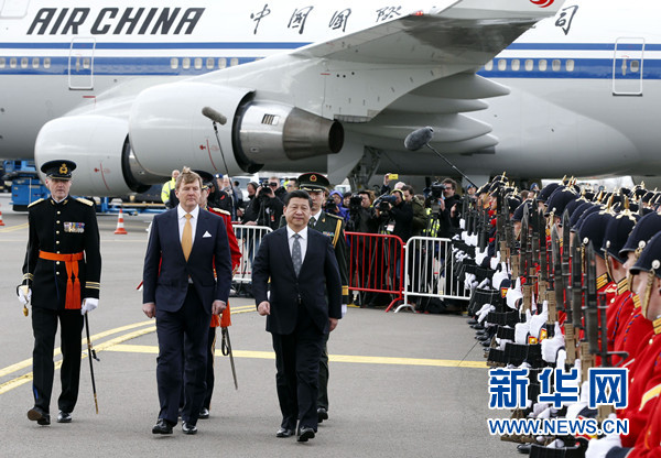 ??? 3月22日,國(guó)家主席習(xí)近平抵達(dá)阿姆斯特丹,應(yīng)荷蘭國(guó)王威廉-亞歷山大邀請(qǐng),對(duì)荷蘭進(jìn)行國(guó)事訪(fǎng)問(wèn),開(kāi)啟歐洲之旅。威廉-亞歷山大在機(jī)場(chǎng)為習(xí)近平舉行隆重歡迎儀式。這是習(xí)近平在威廉-亞歷山大陪同下檢閱儀仗隊(duì)。新華社記者 鞠鵬 攝
