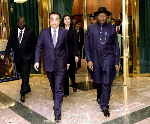新華網(wǎng)北京5月8日電據(jù)新華社“新國(guó)際”微博報(bào)道,李克強(qiáng)7日與尼日利亞總統(tǒng)喬納森會(huì)談。