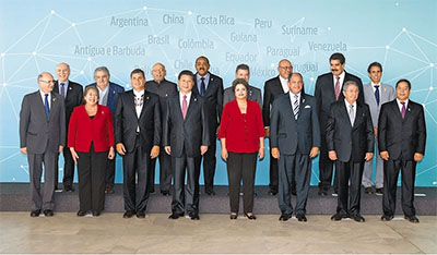 ? 當(dāng)?shù)貢r間7月17日下午,中國—拉美和加勒比國家領(lǐng)導(dǎo)人會晤在巴西利亞舉行。本次會晤由中方倡議,中國國家主席習(xí)近平、巴西總統(tǒng)羅塞夫、哥斯達黎加總統(tǒng)索利斯、古巴國務(wù)委員會主席兼部長會議主席勞爾·卡斯特羅、厄瓜多爾總統(tǒng)科雷亞、蘇里南總統(tǒng)鮑特塞、哥倫比亞總統(tǒng)桑托斯、智利總統(tǒng)巴切萊特、圭亞那總統(tǒng)拉莫塔爾、烏拉圭總統(tǒng)穆???、委內(nèi)瑞拉總統(tǒng)馬杜羅、安提瓜和巴布達總理布朗等出席。