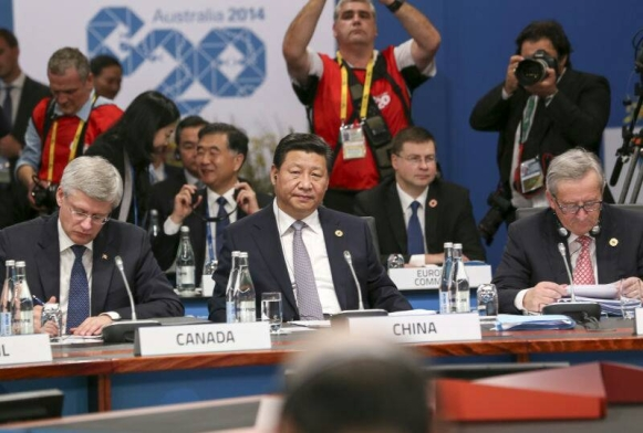 ????(圖為2014年11月15日,二十國(guó)集團(tuán)領(lǐng)導(dǎo)人第九次峰會(huì)在澳大利亞布里斯班舉行。國(guó)家主席習(xí)近平出席會(huì)議并發(fā)表題為《推動(dòng)創(chuàng)新發(fā)展 實(shí)現(xiàn)聯(lián)動(dòng)增長(zhǎng)》的重要講話。新華社發(fā))