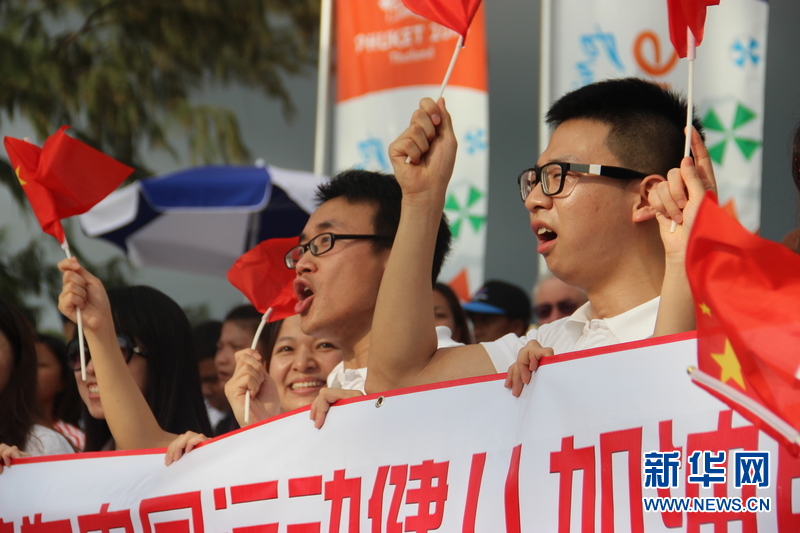 ??? 11月16日,普吉孔子學院的中國志愿者老師們?yōu)橹袊\動健兒加油。中國體育代表團16日在泰國普吉舉行的第四屆亞洲沙灘運動會上勇奪2枚金牌和2枚銅牌。當天比賽全部結(jié)束時,中國隊以3金2銀5銅的成績暫列獎牌榜第五,東道主泰國隊以9金11銀12銅的成績暫列金牌榜和獎牌榜第一。新華社記者楊云燕攝