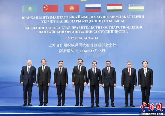 ???? 12月15日,中國國務(wù)院總理李克強在阿斯塔納出席上海合作組織成員國政府首腦理事會第十三次會議。這是與會各國代表團團長集體合影。中新社記者 劉震 攝
