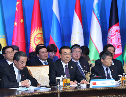 15日阿斯塔納獨立宮,克強總理在上合組織成員國政府首腦理事會第十三次會議大范圍會談上提出三點建議:筑牢地區(qū)安全穩(wěn)定屏障,打造區(qū)域合作新亮點,更加注重民生和人文交流合作。