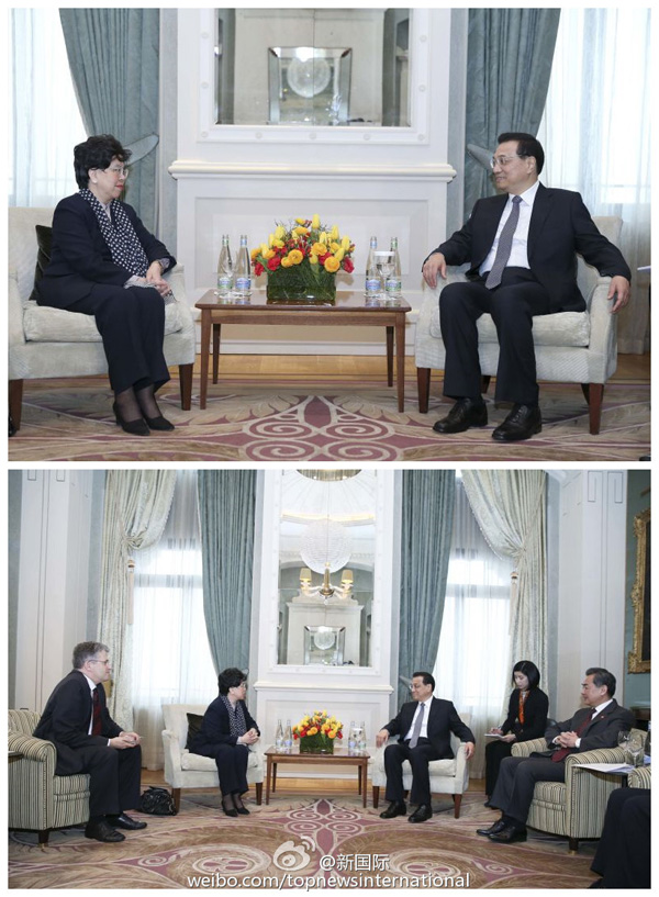????新華網(wǎng)北京1月23日電 據(jù)新華社“新國際”微博報(bào)道,李克強(qiáng)總理22日在蘇黎世會(huì)見世衛(wèi)組織總干事陳馮富珍。他說,中國將盡一個(gè)發(fā)展中大國的責(zé)任,繼續(xù)向埃博拉疫區(qū)提供力所能及的幫助,與國際社會(huì)一道幫助疫區(qū)人民早日驅(qū)除病魔。他贊揚(yáng)陳馮富珍多次親赴疫區(qū),表現(xiàn)出了該組織的無畏精神。