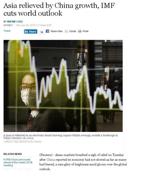 路透社1月20日?qǐng)?bào)道稱中國經(jīng)濟(jì)發(fā)展腳步放緩程度仍舊保持在預(yù)期范圍內(nèi),并沒有許多人想象中的那樣嚴(yán)重,使得整個(gè)亞洲市場(chǎng)松了口氣。