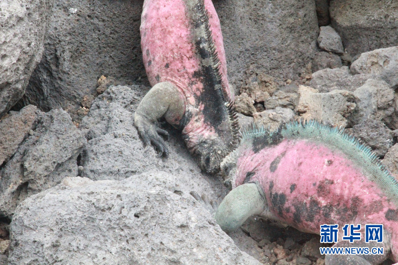 兩只佛羅雷阿納島上的海鬣蜥在爭(zhēng)奪地盤(pán)。到了繁殖期的海鬣蜥皮膚會(huì)呈現(xiàn)出大紅大綠的顏色,情緒也會(huì)高漲起來(lái)。