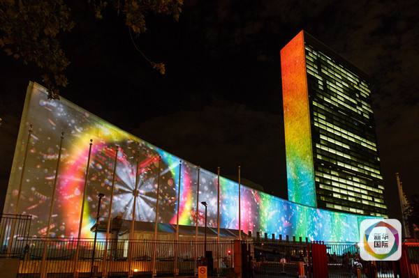 ↑9月22日,聯(lián)合國(guó)總部大樓外投影顯示可持續(xù)發(fā)展目標(biāo)宣傳畫面。(新華社記者李木子攝)
