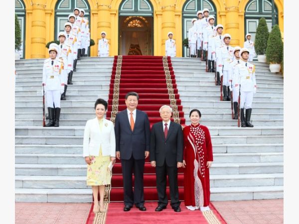 11月5日,中共中央總書記、國家主席習(xí)近平在河內(nèi)同越共中央總書記阮富仲舉行會(huì)談。這是會(huì)談前,習(xí)近平出席阮富仲在主席府廣場舉行的盛大歡迎儀式。新華社記者蘭紅光攝