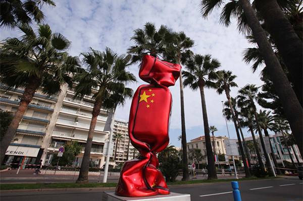 2011年11月3日至4日,G20領(lǐng)導人峰會在戛納舉行。圖為10月31日在法國南部小城戛納拍攝的外表被包裝成中國國旗的糖果雕塑。新華社記者高靜攝