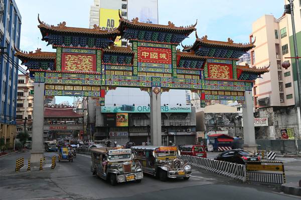 11月15日,汽車從馬尼拉唐人街的牌匾前駛過。(新華社記者李鵬攝)
