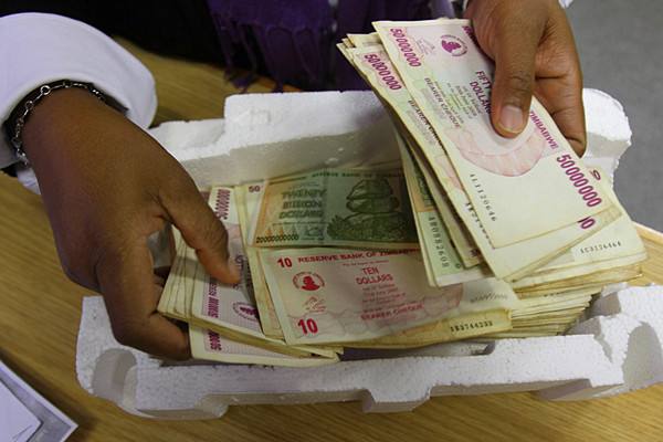 2015年6月15日,在首都哈拉雷一家銀行內(nèi),一名當(dāng)?shù)厝四弥蛟獪?zhǔn)備兌換美元。津巴布韋當(dāng)日起回收不再流通的津巴布韋元,1張100萬(wàn)億津元紙幣僅可兌換40美分。(新華社發(fā))