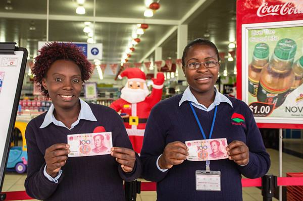 2015年11月19日,在津巴布韋首都哈拉雷一家超市前,兩名售貨員拿著人民幣擺拍。(新華記者許林貴攝)
