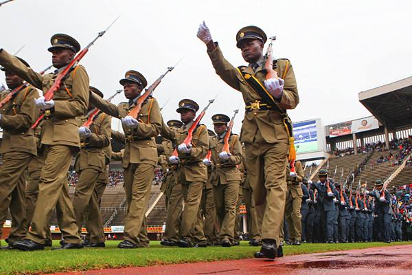 2015年4月18日,在中國援建的津巴布韋國家體育場內(nèi),津國防軍進行表演。(新華社發(fā),費列蒙攝)