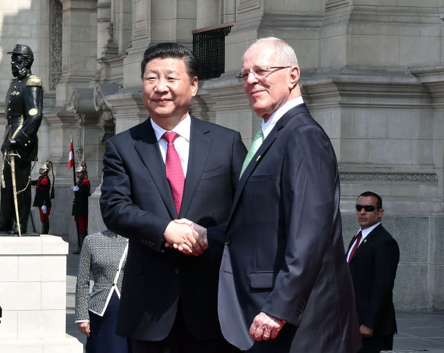 11月21日,國(guó)家主席習(xí)近平在利馬同秘魯總統(tǒng)庫(kù)琴斯基舉行會(huì)談。會(huì)談前,習(xí)近平出席庫(kù)琴斯基在總統(tǒng)府前廣場(chǎng)舉行的歡迎儀式。(新華社記者 李濤 攝)