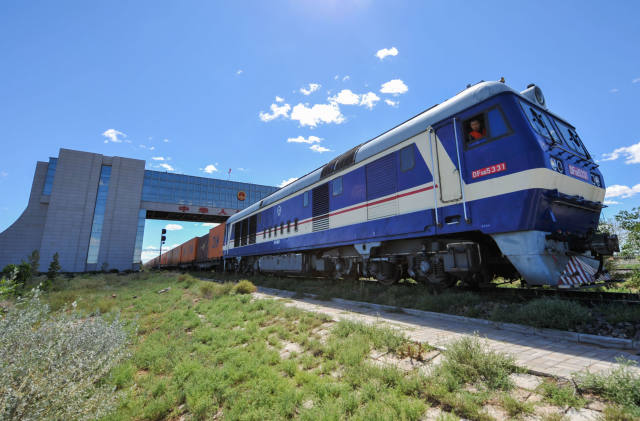 2016年8月27日,一列中歐班列貨運(yùn)列車駛出二連浩特國(guó)門。(新華社記者 連振攝)
