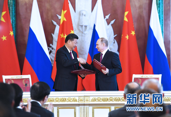 7月4日,國(guó)家主席習(xí)近平在莫斯科克里姆林宮同俄羅斯總統(tǒng)普京舉行會(huì)談。會(huì)談后,兩國(guó)元首簽署了《中華人民共和國(guó)和俄羅斯聯(lián)邦關(guān)于進(jìn)一步深化全面戰(zhàn)略協(xié)作伙伴關(guān)系的聯(lián)合聲明》《中華人民共和國(guó)和俄羅斯聯(lián)邦關(guān)于當(dāng)前世界形勢(shì)和重大國(guó)際問題的聯(lián)合聲明》,批準(zhǔn)了《〈中華人民共和國(guó)和俄羅斯聯(lián)邦睦鄰友好合作條約〉實(shí)施綱要(2017年至2020年)》并見證了《中華人民共和國(guó)外交部和俄羅斯聯(lián)邦外交部關(guān)于朝鮮半島問題的聯(lián)合聲明》以及經(jīng)貿(mào)、農(nóng)業(yè)、能源、基礎(chǔ)設(shè)施建設(shè)、金融、文化、創(chuàng)新、媒體、信息網(wǎng)絡(luò)、檢驗(yàn)檢疫等領(lǐng)域多項(xiàng)雙邊合作文件的交換。新華社記者 劉衛(wèi)兵 攝